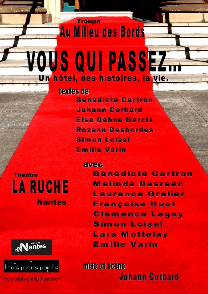 Jeu : Bénédicte Cartron / Angie Degres / Melinda Desreac / Arnaud Garnier / Marion Larrère / Stéphane Le Texier / Simon Loisel / Clémence Legay / Marc Macé / Anne-Claire Maisonneuve / Isabelle Maqueda / Emilie Varin / Gilles Ventura